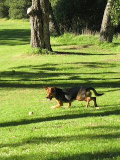 Lola anxiously awaiting Kevin to throw the ball for her